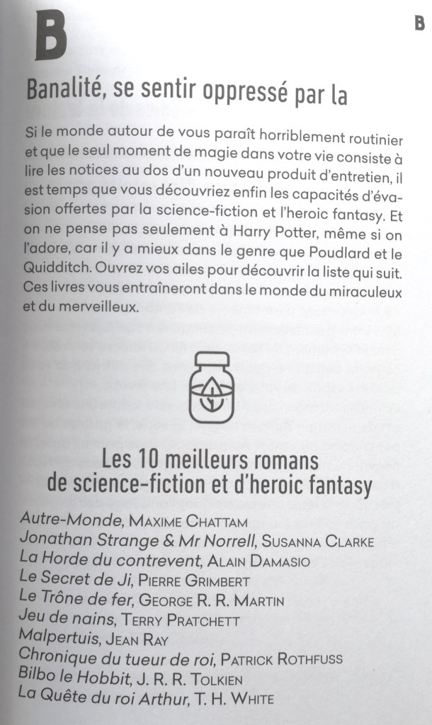 Référencés par ordre alphabétique un peu comme dans un dictionnaire classique, les maux sont décrits sous un ton dédramatisant, de quoi décrocher au lecteur/malade à minima un grand petit sourire. A chaque mal, est proposé par des libraires ou les auteurs, un ou plusieurs livres (très surprenant parfois) qui mettent en lumière la maladie et sa cure. C’est l’occasion également pour les libraires de glisser leurs recommandations « Les 10 meilleurs romans -à lire avant 30 ans/ 40 ans- à lire sur le trône- de SF – … »