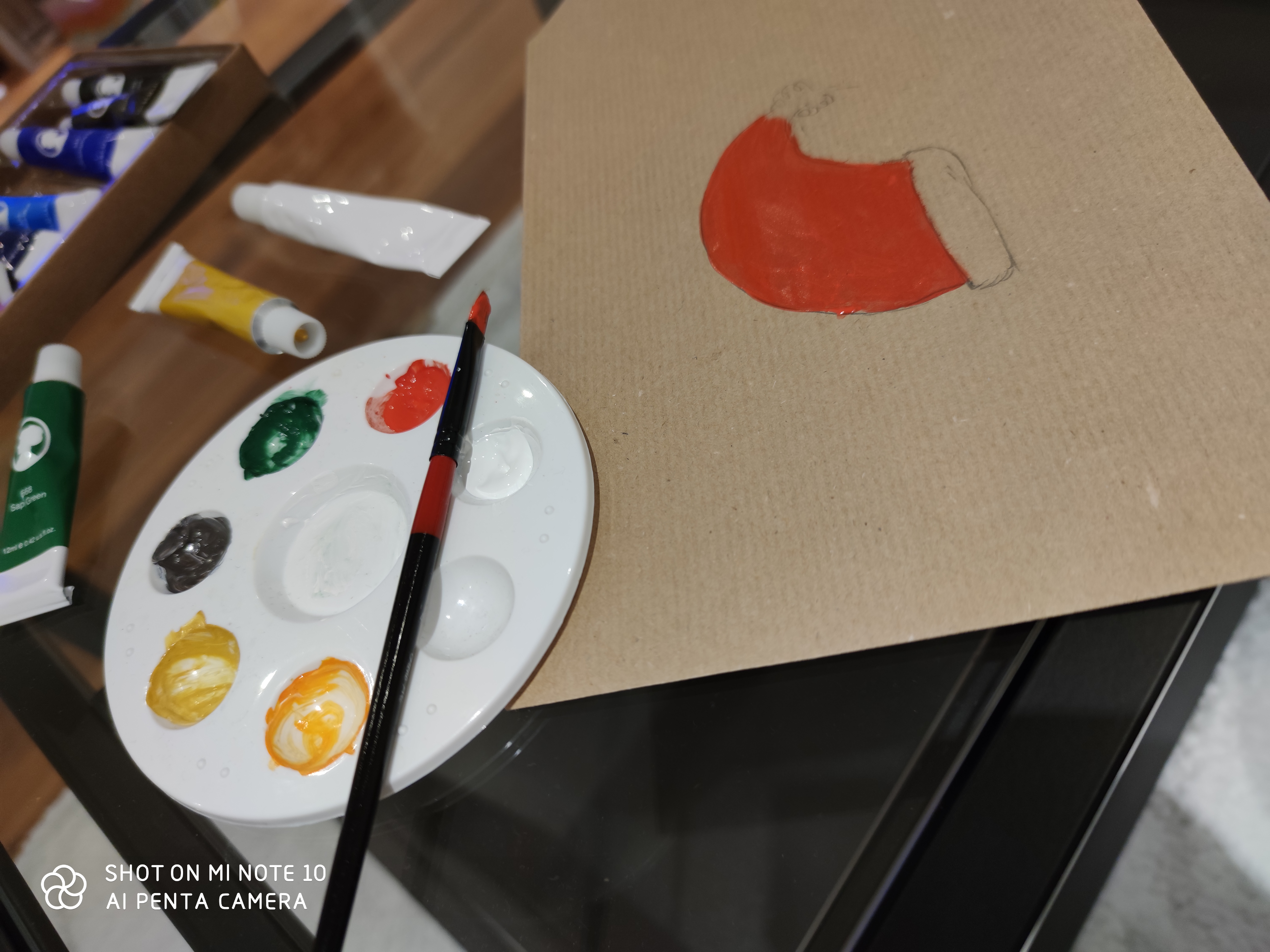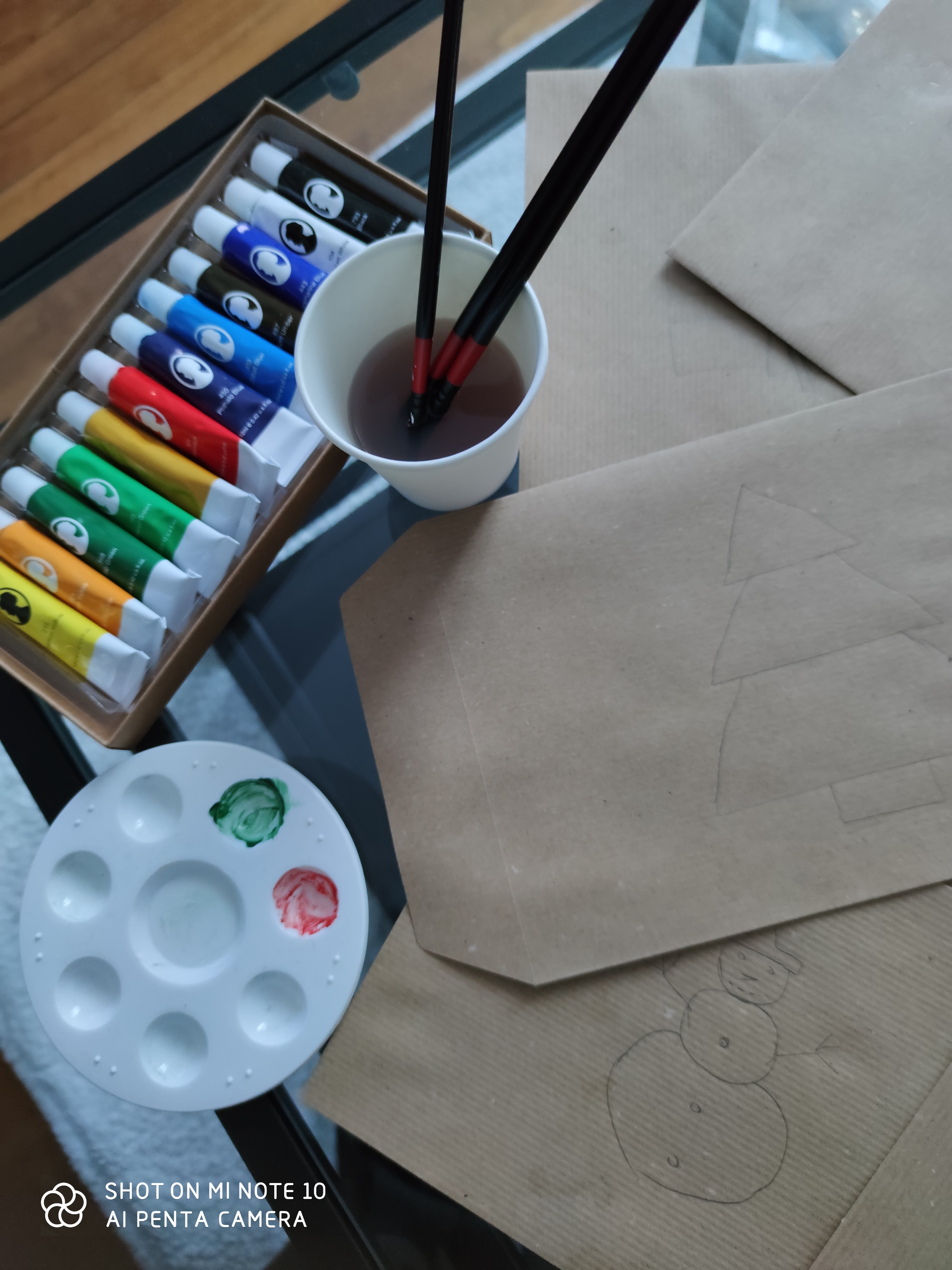 J’ai poussé le truc encore plus loin et n’ai décidé que d’utiliser ce que j’avais à la maison pour la décoration: de l’acrylique, des pinceaux, un crayon, une gomme et mes doigts pour le reste.