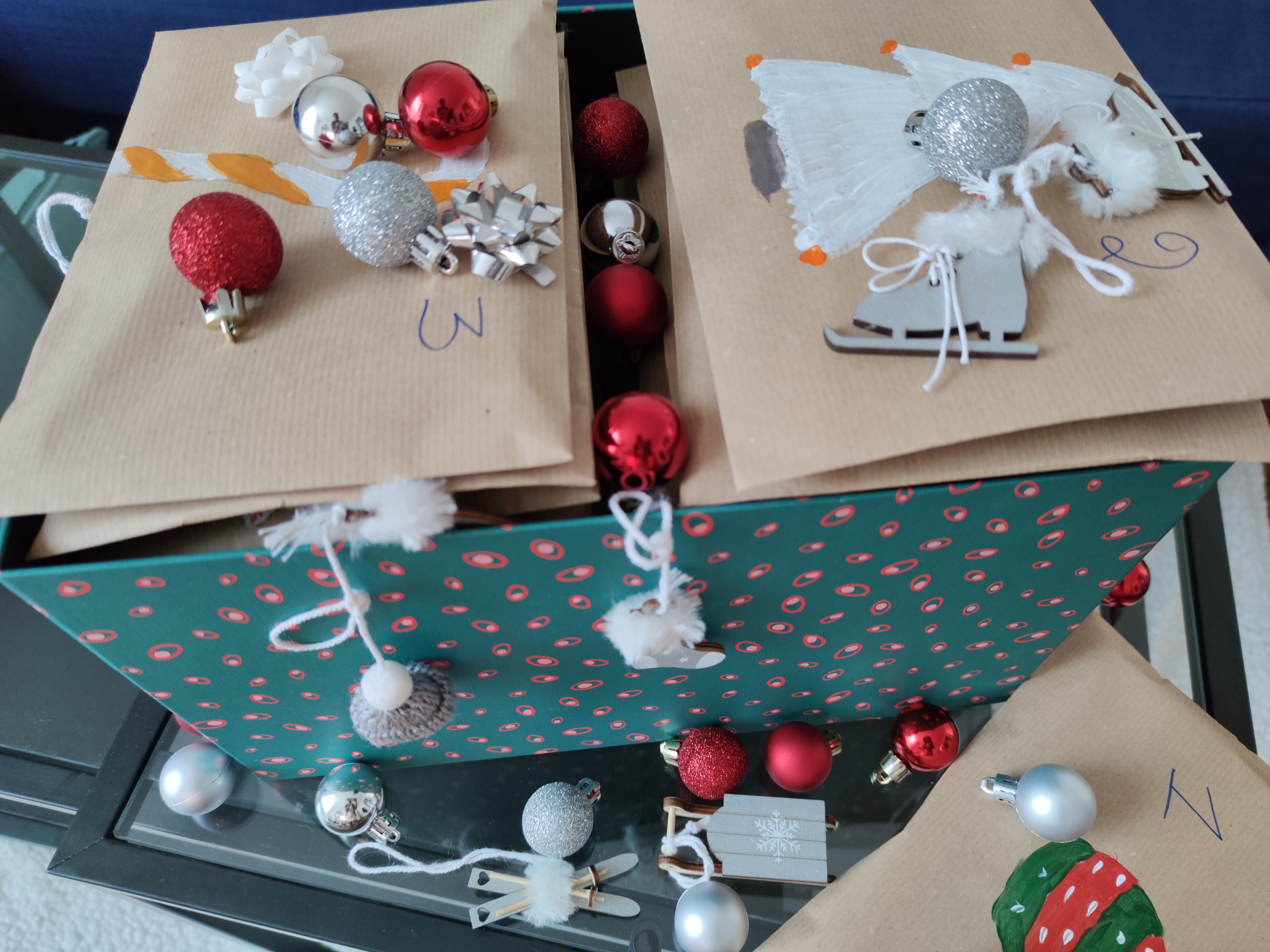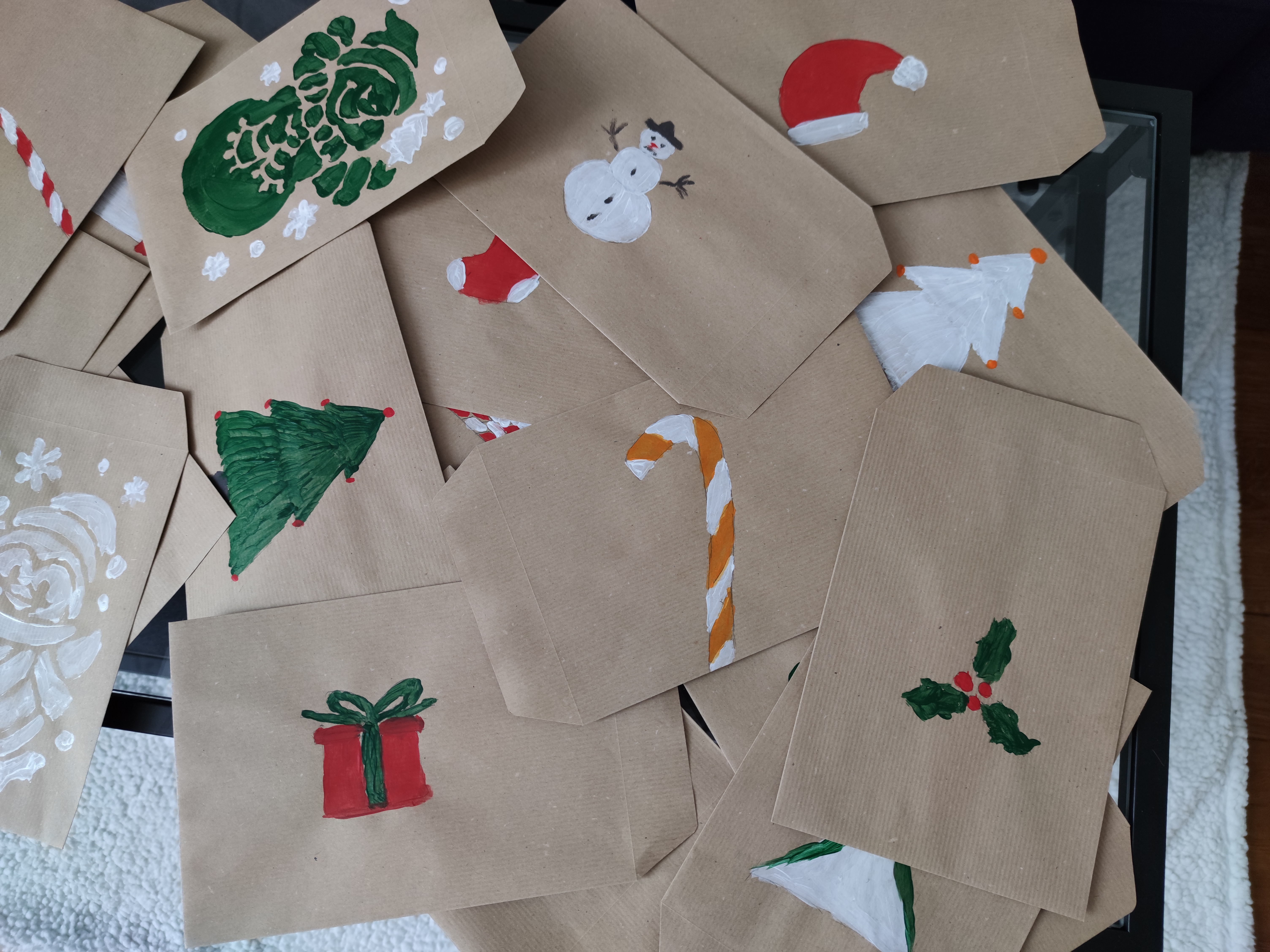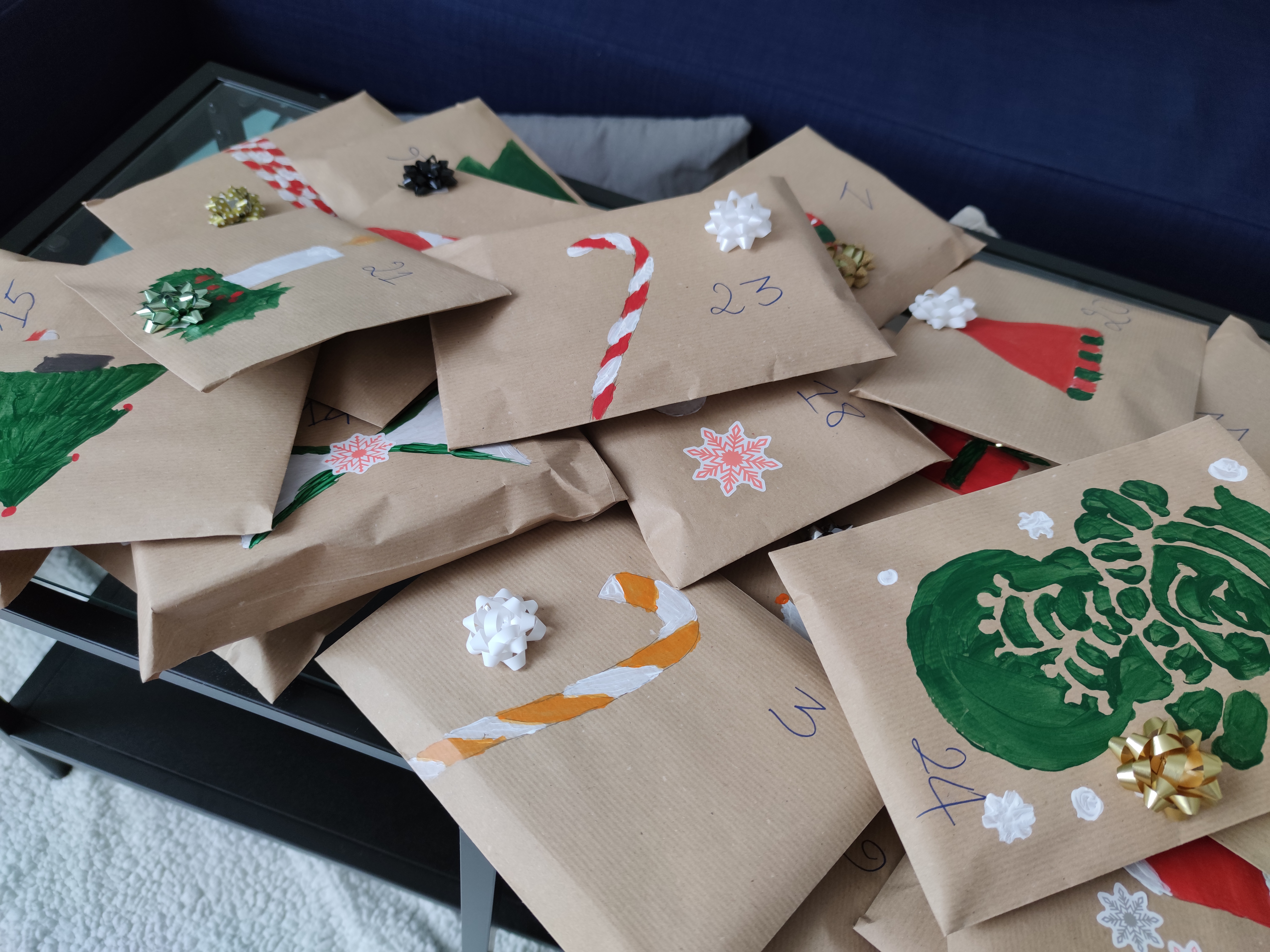 Il ne restait plus qu’à glisser les articles dans les enveloppes, coller des stickers de déco et numéroter chacune des enveloppes (pour faire notre compte à rebours de 1 à 24). J’ai pris le soin de mixer les enveloppes après avoir rangé les articles à l’intérieur, je voulais conserver l’effet de surprise pour chacun des jours J .