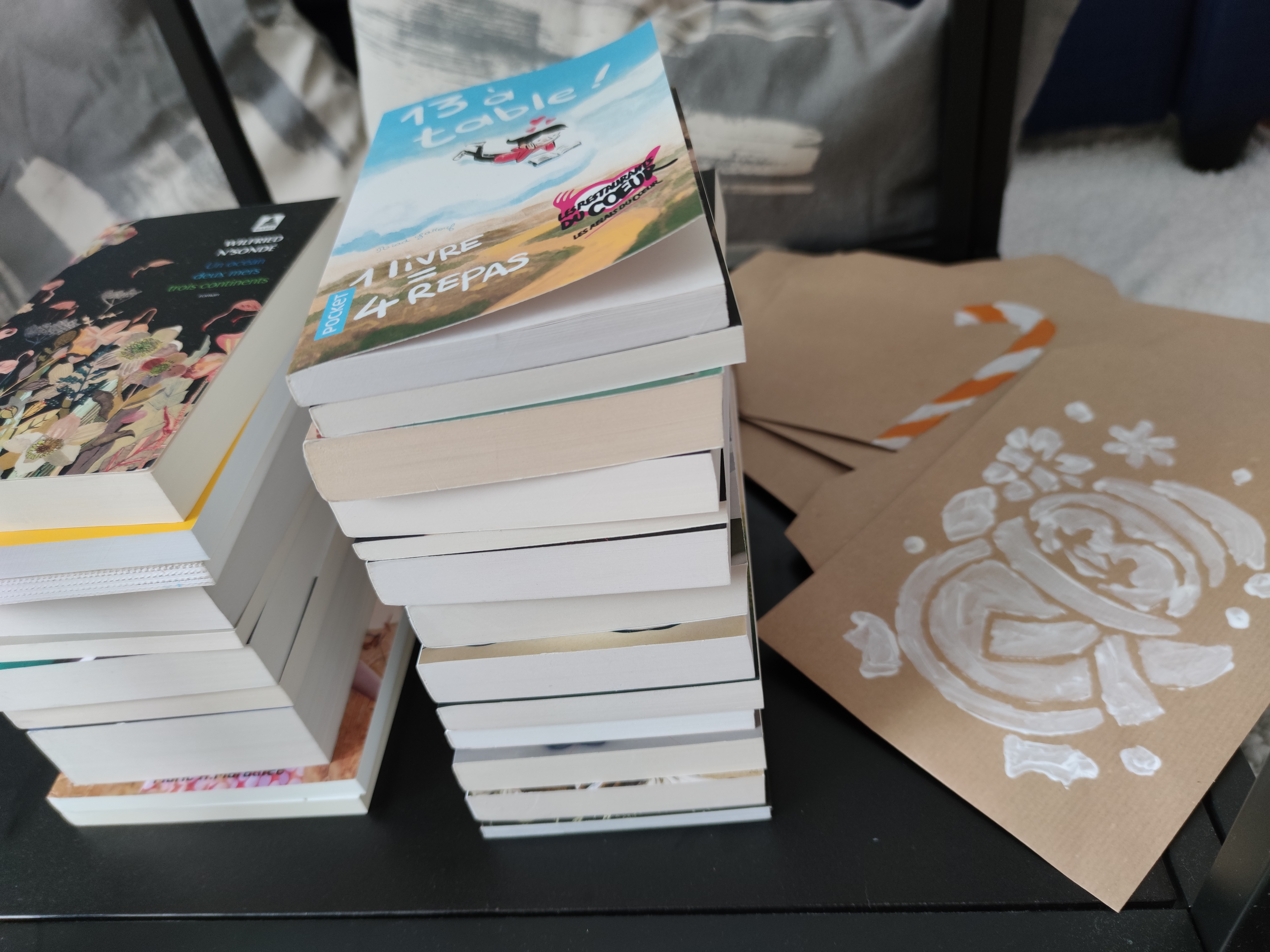 Cette année, vu que je me sers exclusivement de romans au format poche, j’ai décidé d’aller au plus simple et de les glisser dans des enveloppes. Et le petit travail manuel/artistique sera de créer des décorations sympathiques pour toutes ces enveloppes.