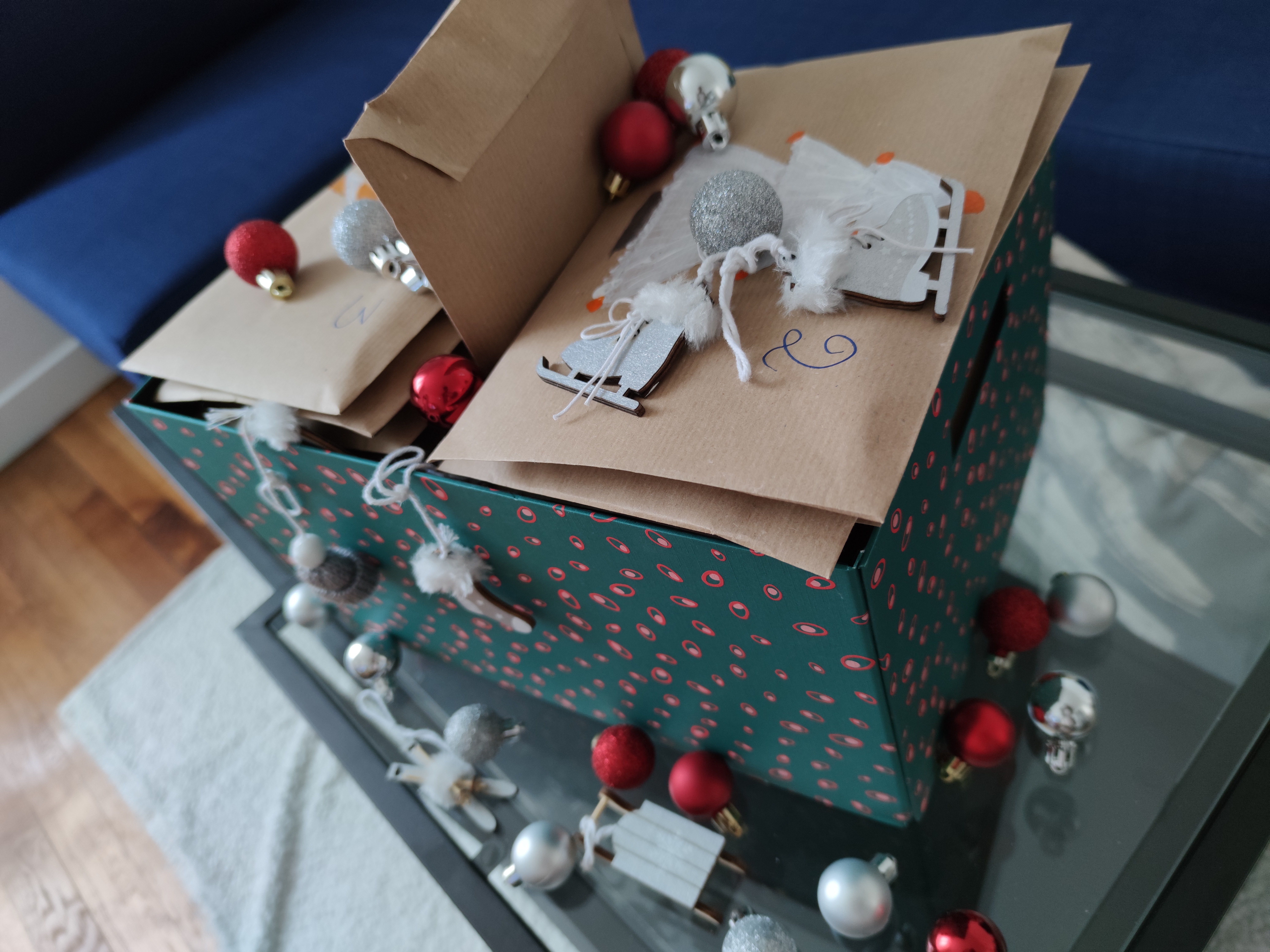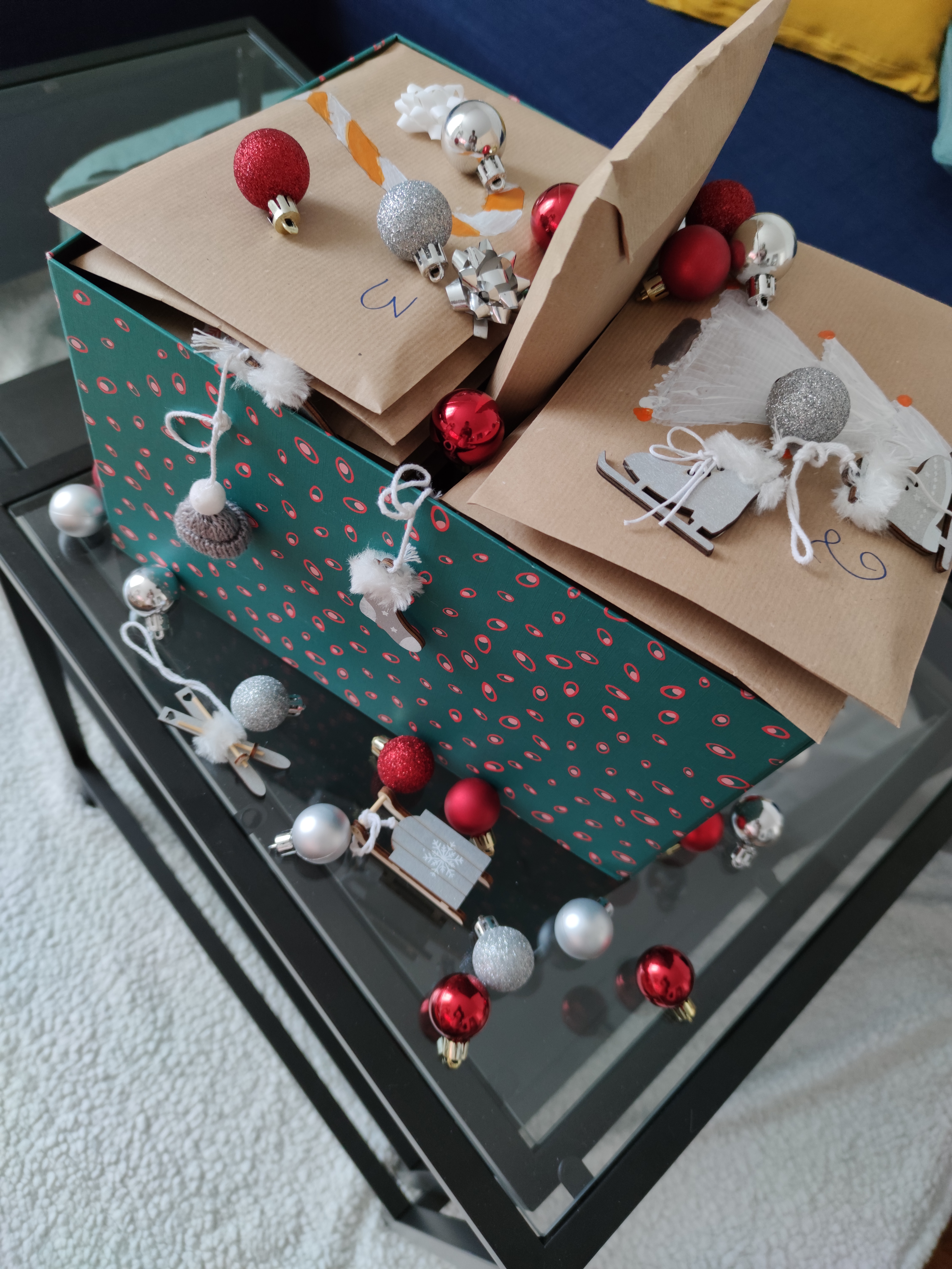 J’ai rangé tout mes petites enveloppes dans une boite que j’ai parsemé de décorations de Noël et …. TADAAAA <o) <o) <o)